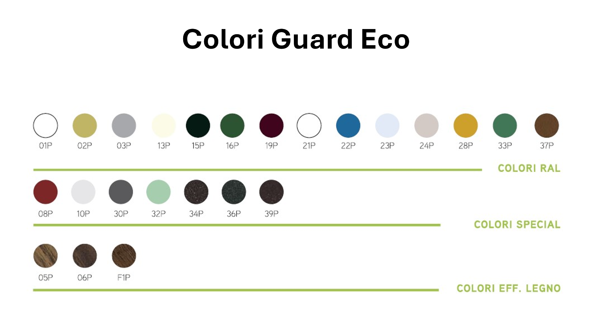 Guard Eco è disponibile in una gamma di colori pensata per integrarsi con le facciate condominiali esistenti e con i progetti di ristrutturazione più recenti. Puoi scegliere tra tinte neutre, tonalità più decise e finiture effetto legno, così da coordinare le tapparelle con infissi in PVC, alluminio o acciaio senza strappi estetici.