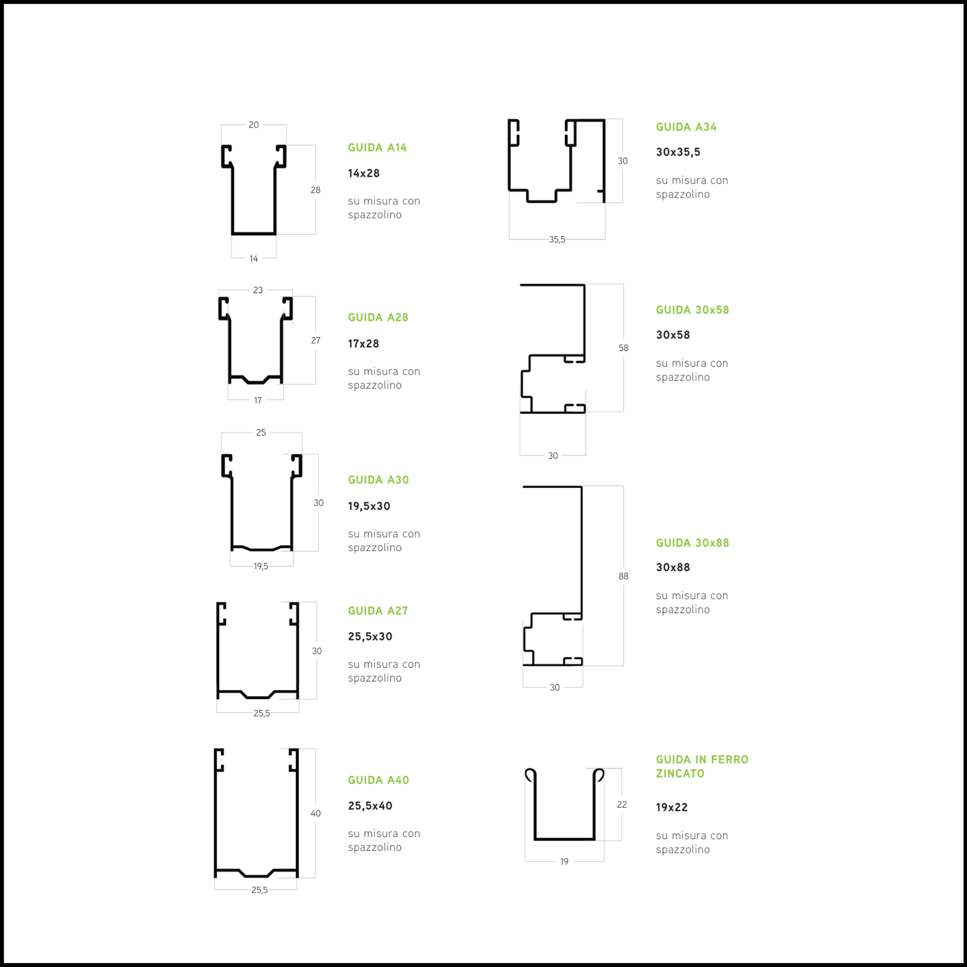 Per avvolgibili di sicurezza e serrande (acciaio, alluminio estruso ad alto spessore, profili autobloccanti) si utilizzano guide dedicate, caratterizzate da: