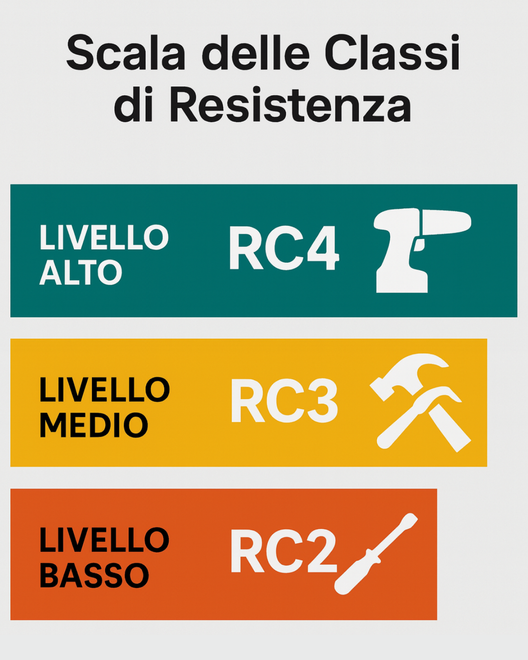 Per capire quanto resiste davvero un sistema a un tentativo di scasso, si usa la Classe di resistenza (RC – Resistance Class): una scala che tiene conto di strumenti, modalità e tempi di attacco.