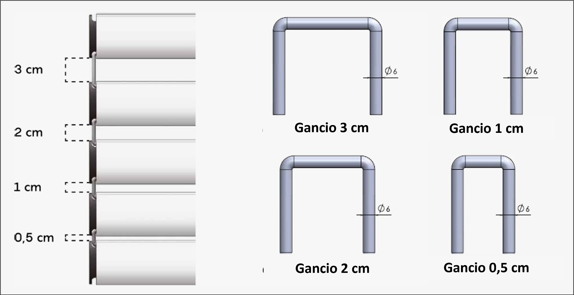 misura dei ganci distanziali (30, 20, 10, 5 mm);